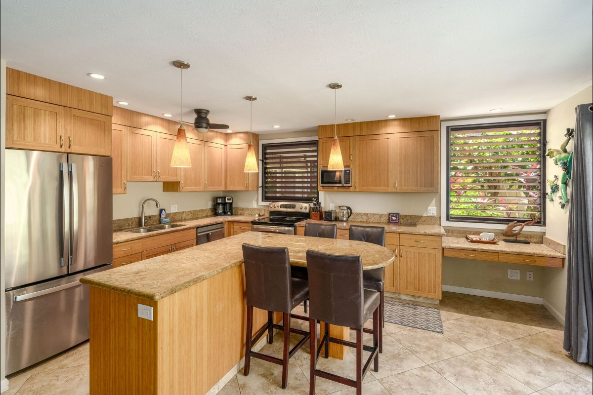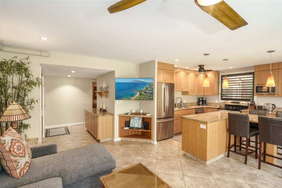 Every comfort and convenience has been anticipated by this unit’s San Diego based owner, and it’s been beautifully renovated top to bottom. Split AC to cool the unit, a luxury King bed in the master and two twin beds in the second bedroom. The kitchen is replete with every necessity, including blender, coffee maker, and cooking/serving implements to create your own island feast should the desire strike. The kitchen remodel blends the warmth of golden bamboo and stunning granite, embracing the high-end Hawaiiana theme of the unit.