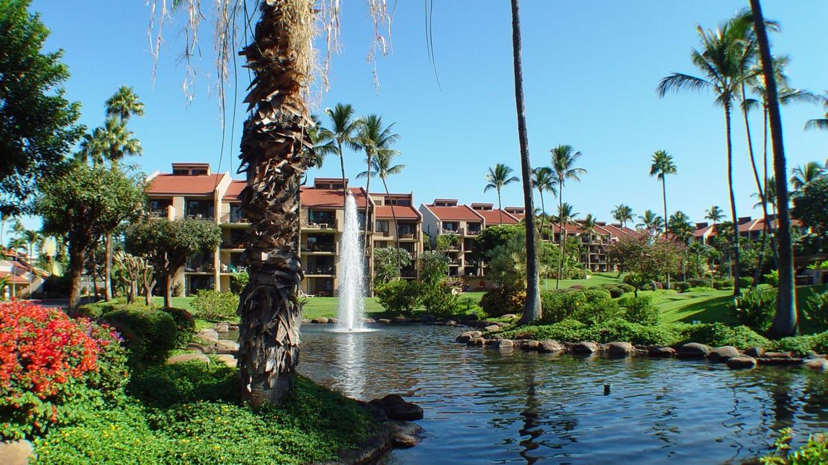 Gorgeous Kamaole Sands resort in South Kihei next to Wailea with Fifteen acres of lush tropical grounds with fishponds, fountains, waterfalls, and abundance of tropical plants and flowers.
