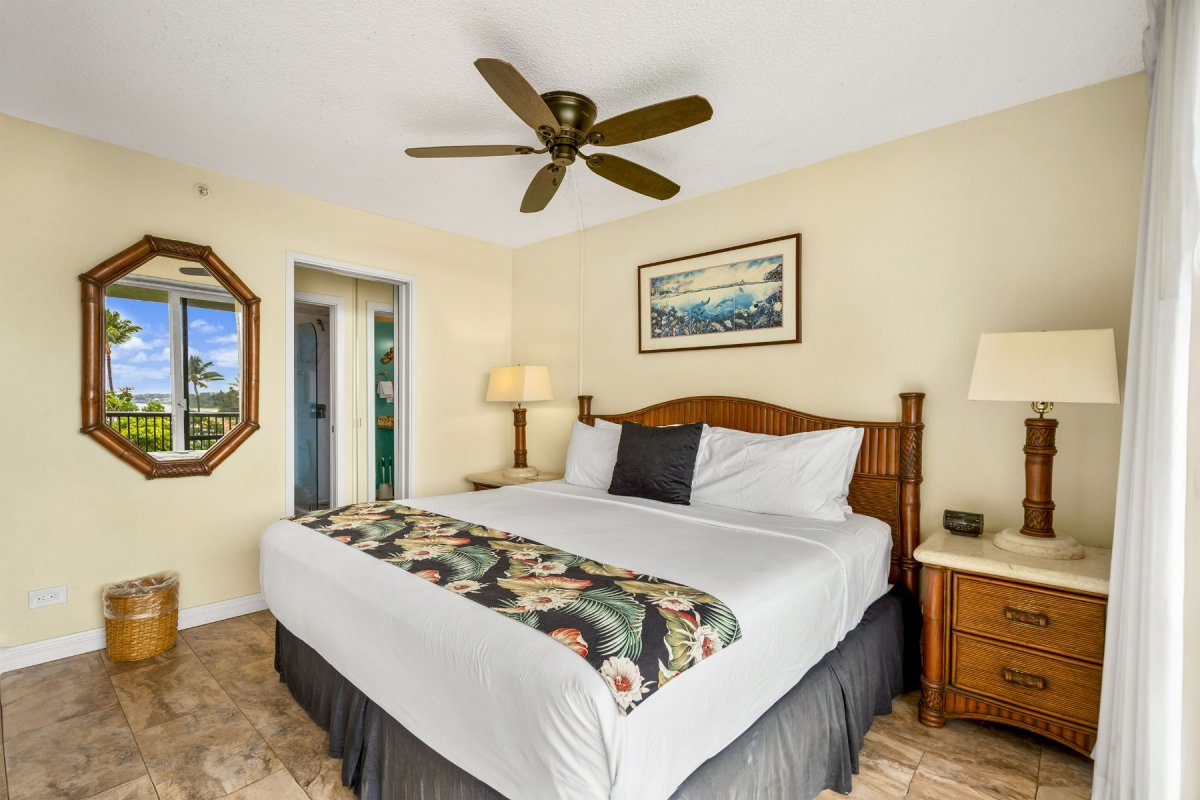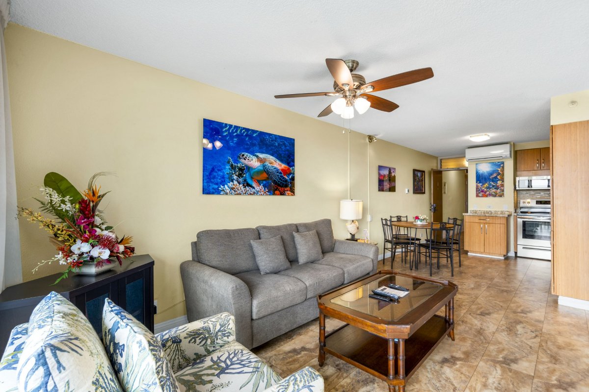 Sleep the sound of the waves and experience one of the island's best ocean views from your living room and lanai. Tropical breezes waft through the condo with your open lanai door, or relax in air conditioned comfort throughout the unit.