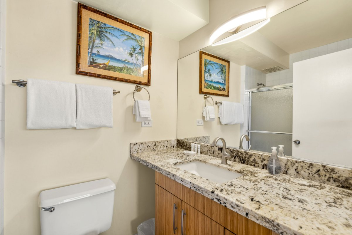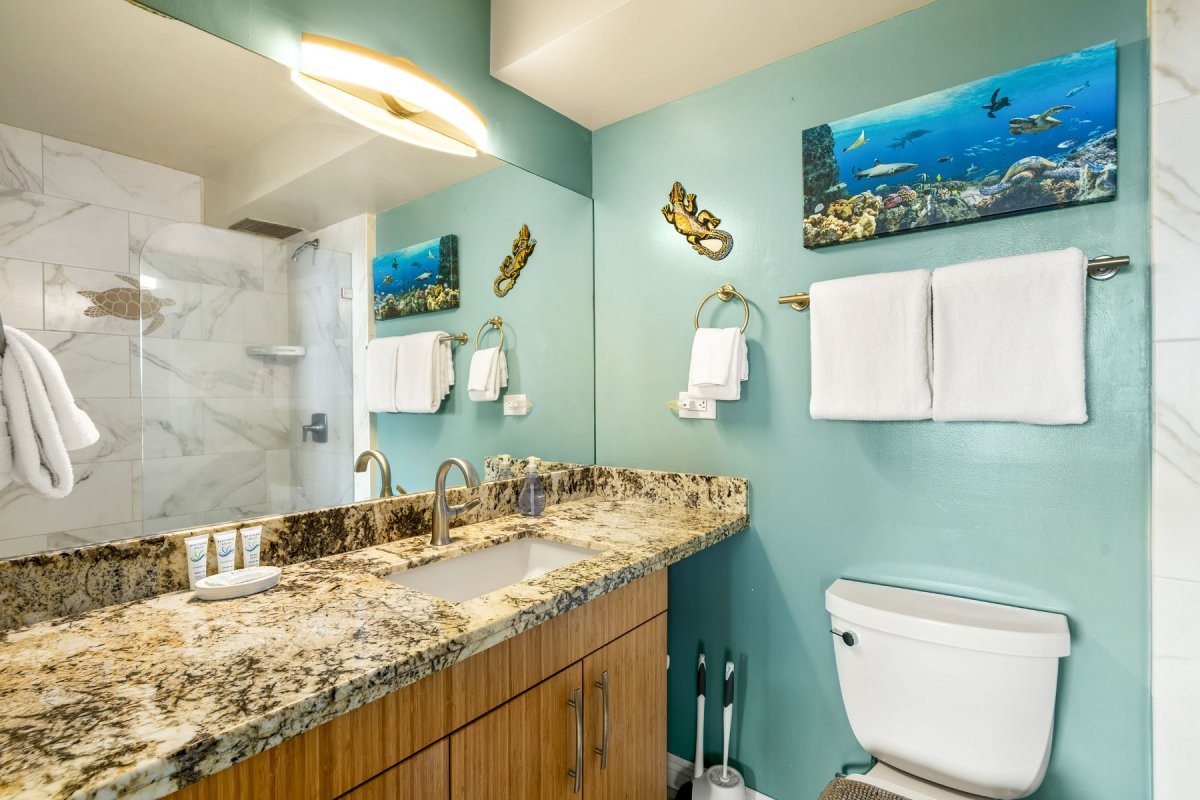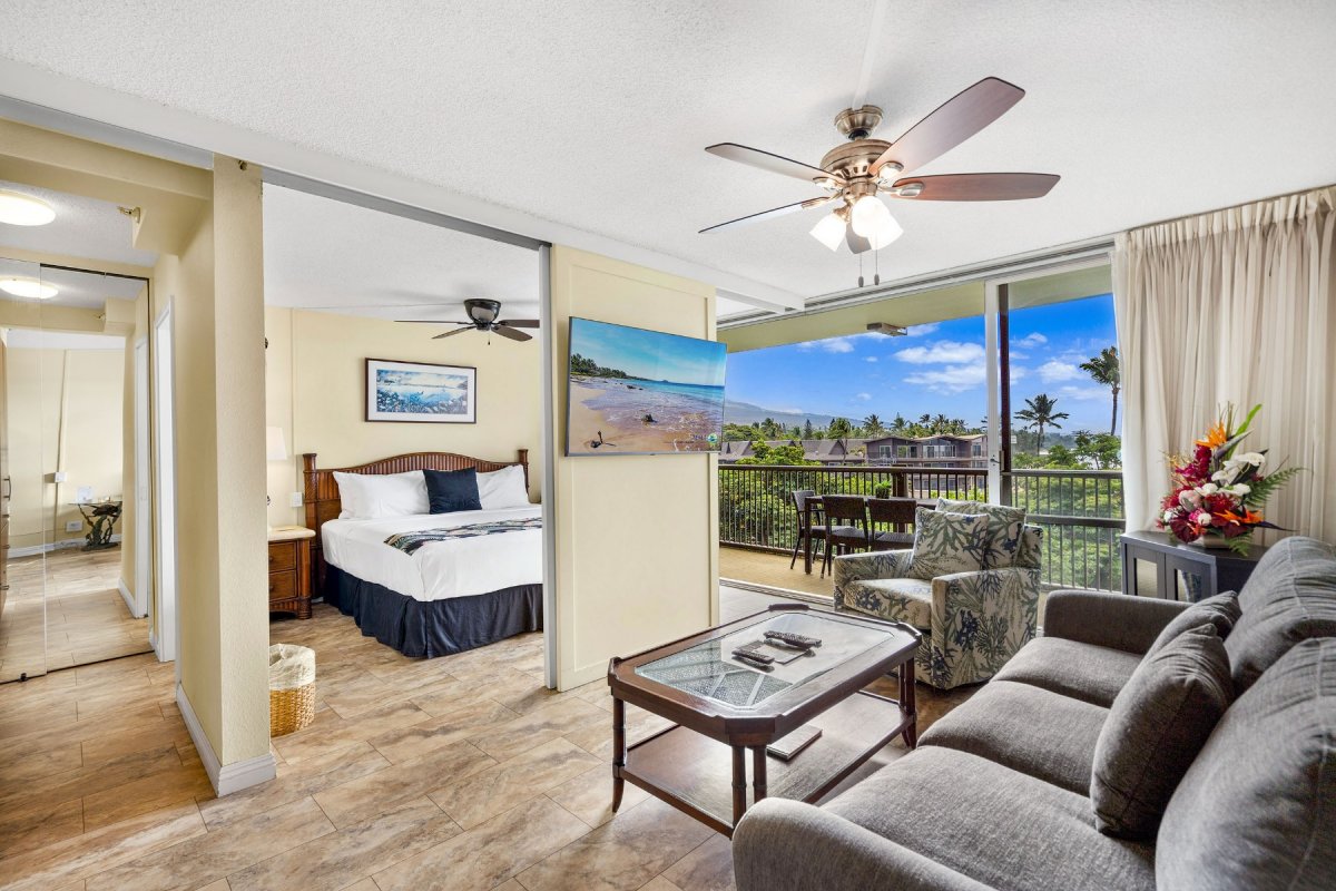 Inside, the unit has every imaginable convenience -- the San Diego based owners set it up for their Maui getaway, and equipped it for style and comfort. Split-system AC chills the unit, and high-speed WiFi is free. New furnishings and art, a beautifully remodeled kitchen, new high-end King mattresses and luxury linens, and a full compliment of beach gear provide the ultimate setting for your Maui getaway, for up to four guests. The two bedrooms have excellent separation: one has spectacular ocean views, the other a peek of the ocean.