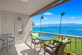 Enjoy panoramic oceanfront views from Maalaea Kai 311, 50 feet to the water! Updated interior with tropical decor, A/C in living room & bedroom, & WIFI. Relax with the sound of the ocean and the swaying palms & watch the sea turtles bobbing in the ocean.