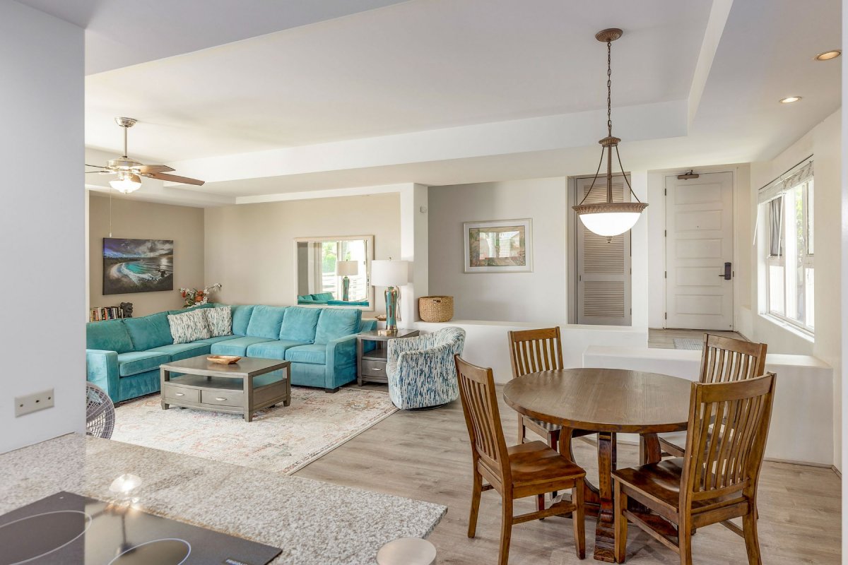 Embrace the island breeze in the open-air living room, where a stylish sleeper sectional and a cozy armchair await. Unwind together and stream your favorite shows on the smart TV.